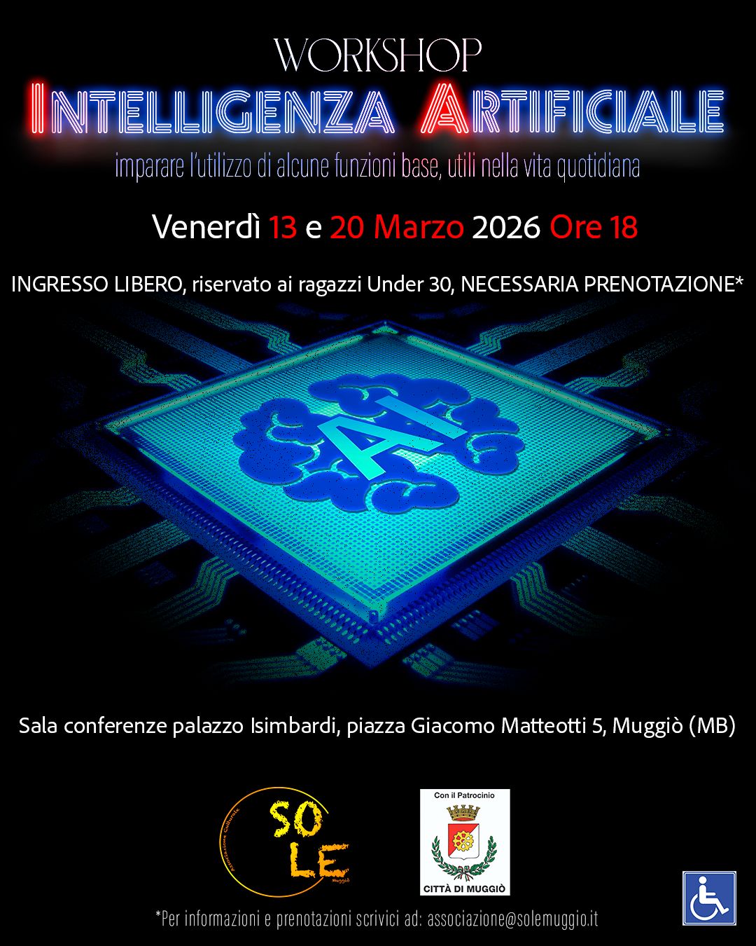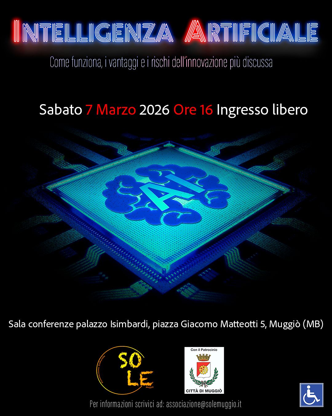L'Associazione So.Le di Muggiò, con il patrocinio del Comune, nell'ambito della propria missione di promozione della cultura della legalità, dell' educazione civica e contrasto ai fenomeni di disagio giovanile, è lieta di presentare il corso sull'utilizzo e i rischi dell' intelligenza artificiale, presso la sala di Palazzo Isimbardi nelle seguenti giornate: