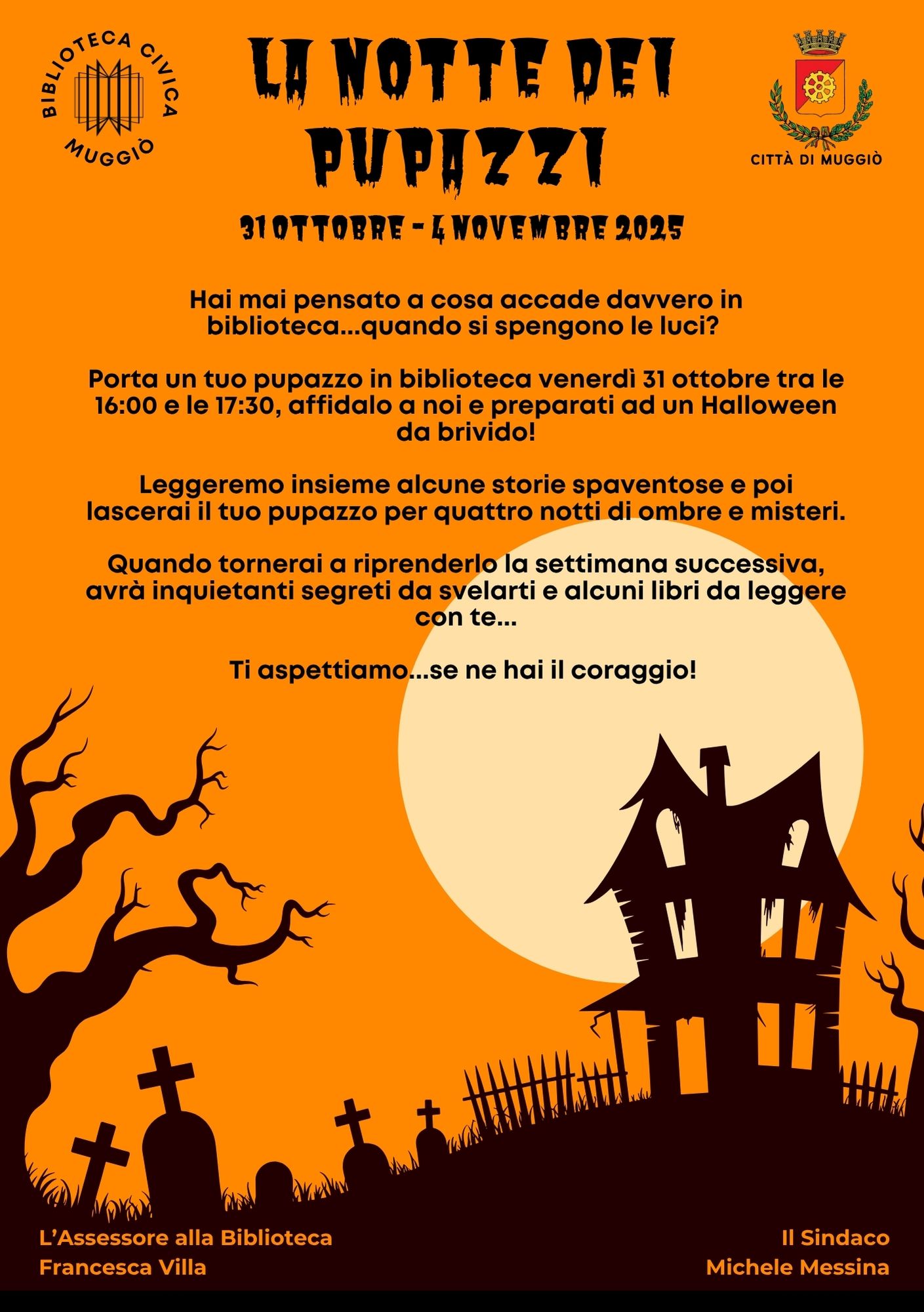 Tutti i bambini e le bambine sono invitati a portare un proprio pupazzo in biblioteca venerdì 31 ottobre tra le 16:00 e le 17:30 per fargli vivere un’avventura notturna in biblioteca insieme ad altri pupazzi. Prima di consegnare il pupazzo, leggeremo a tutti i bambini alcune storie da brivido!