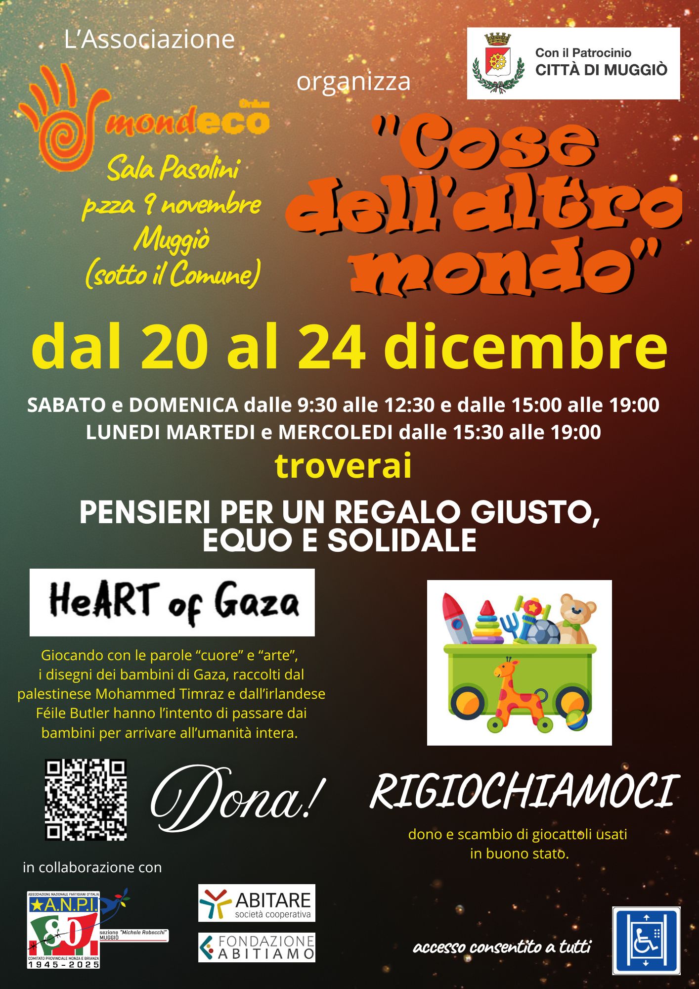 Siete tutti invitati a visitare la mostra "Cose dell'altro mondo" organizzata dall'Associazione Mondeco ONLUS con il Patrocinio del Comune di Muggiò, nella quale saranno esposte opere d'arte dei bambini di Gaza. L'evento sarà inaugurato sabato 20 dicembre presso il Centro Culturale Pier Paolo Pasolini, in PIazza IX novembre dalle ore 9,30.