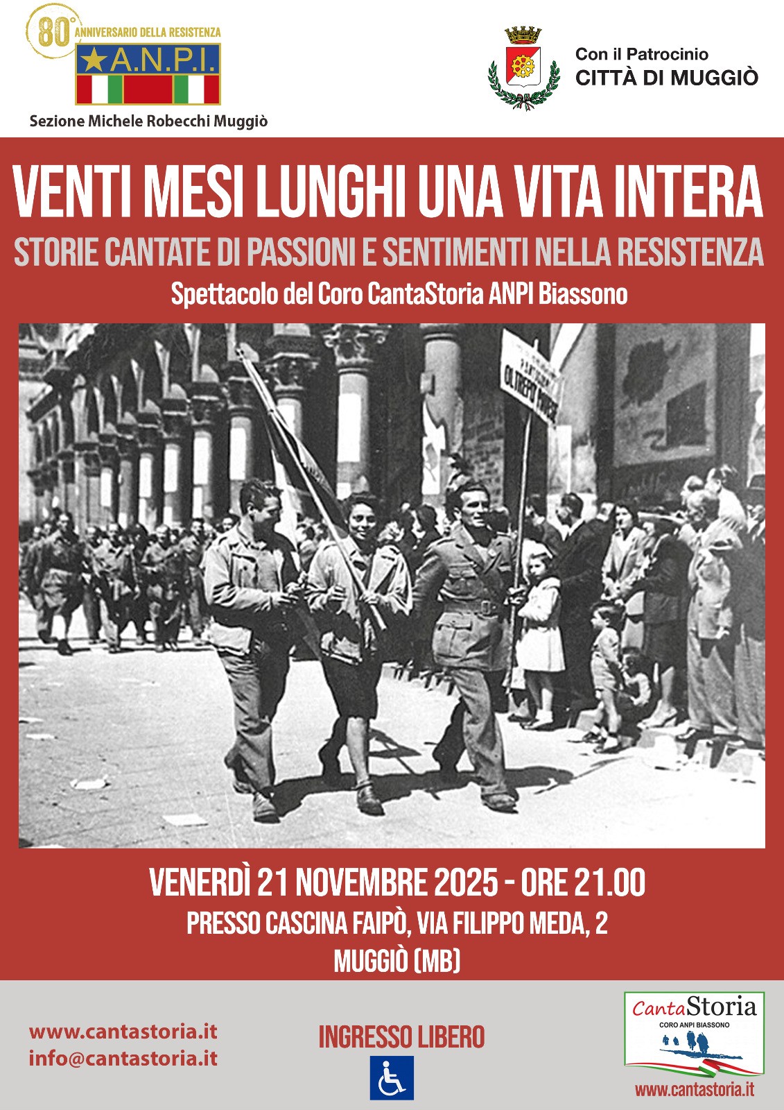 Venerdì 21 novembre dalle ore 21,00 alle ore 23,00 l'Associazione ANPI di Muggiò, con il patrocinio del Comune, organizza una serata commemorativa insieme al Coro CantaStoria di Biassono, presso la sala di Cascina Faipò. Ingresso libero