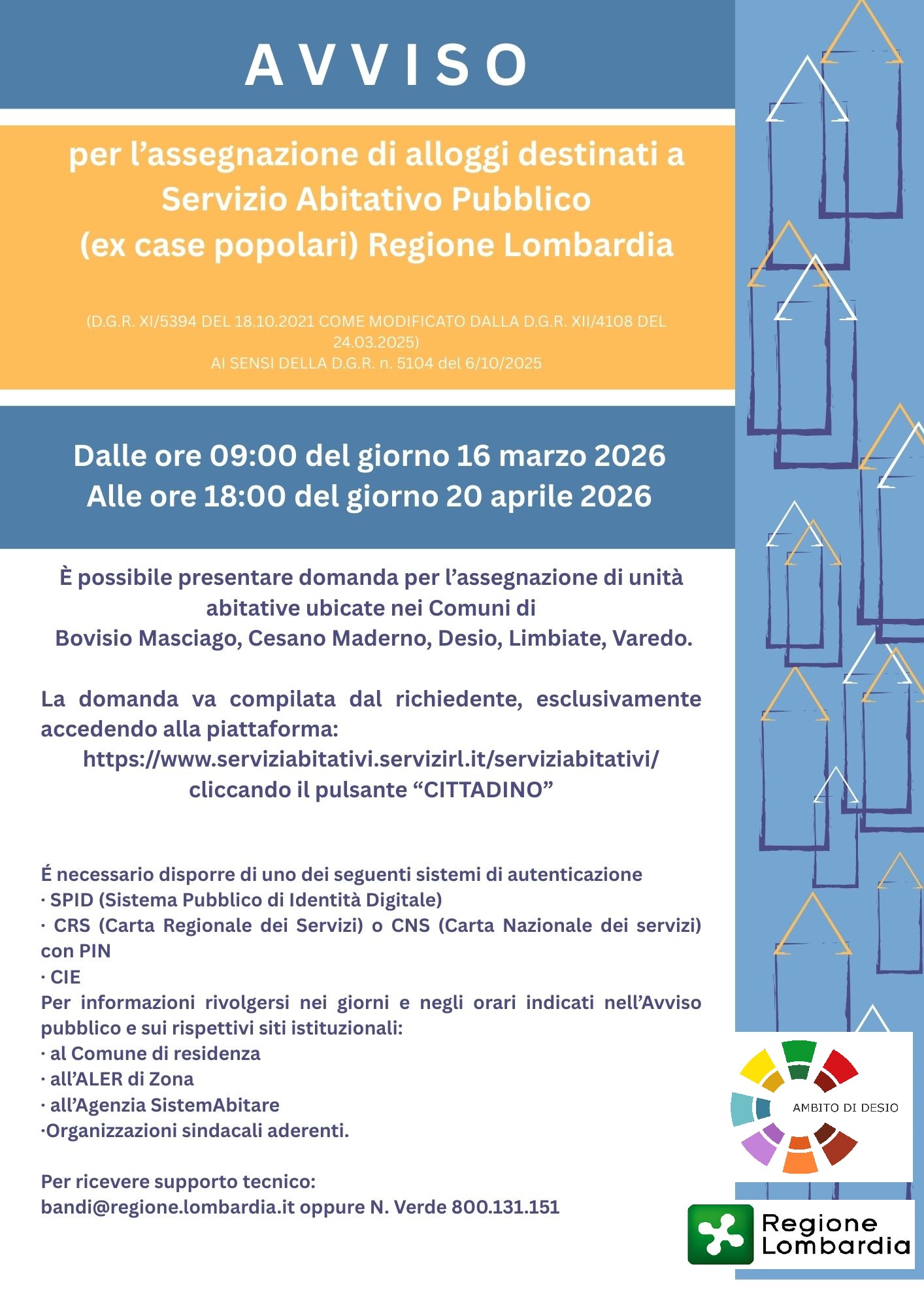 Ai sensi dell’art. 8 del Regolamento Regionale n. 4 del 04/08/2017 e ss.mm.ii. è stato indetto l’avviso pubblico per l’assegnazione di unità abitative disponibili nell’Ambito territoriale di Desio (Muggiò, Nova Milanese, Varedo, Bovisio Masciago, Limbiate, Cesano Maderno, Desio) destinate ai servizi abitativi pubblici.